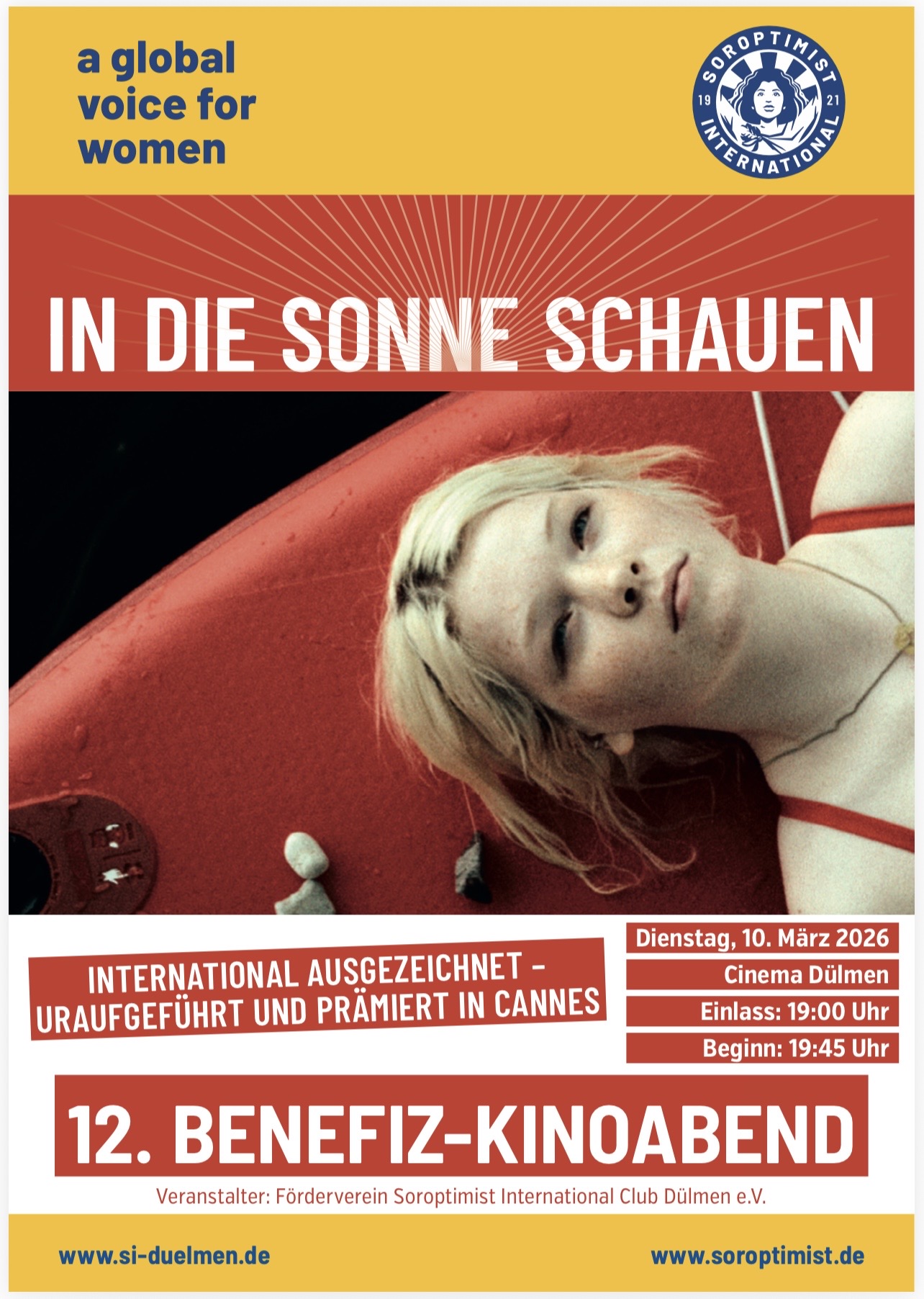 In die Sonne schauen – das bedeutet Hoffnung, Wärme, vielleicht auch Mut. Genau darum geht es beim 12. Benefiz-Kinoabend des SI-Club Dülmen am Dienstag, 10. März 2026, im Cinema Dülmen. Gezeigt wird der preisgekrönte Cannes-Film „In die Sonne schauen“ von Mascha Schilinski. Im Mittelpunkt stehen vier junge Frauen: Alma, Erika, Angelika und Lenka. Sie leben in unterschiedlichen Zeiten, vom Ersten Weltkrieg bis in die Gegenwart und doch verbindet sie etwas Entscheidendes: Sie alle haben zu ihrer jeweiligen Zeit am gleichen Ort gelebt. Der Film erzählt ihre Geschichten nicht nebeneinander, sondern wie ein leises Echo über ein ganzes Jahrhundert hinweg. Was bleibt von einem Leben? Welche Spuren hinterlassen Erwartungen, Rollenbilder, gesellschaftliche Blicke? Und was macht es mit einem Menschen, wenn er immer wieder bewertet, beobachtet, eingeordnet wird?