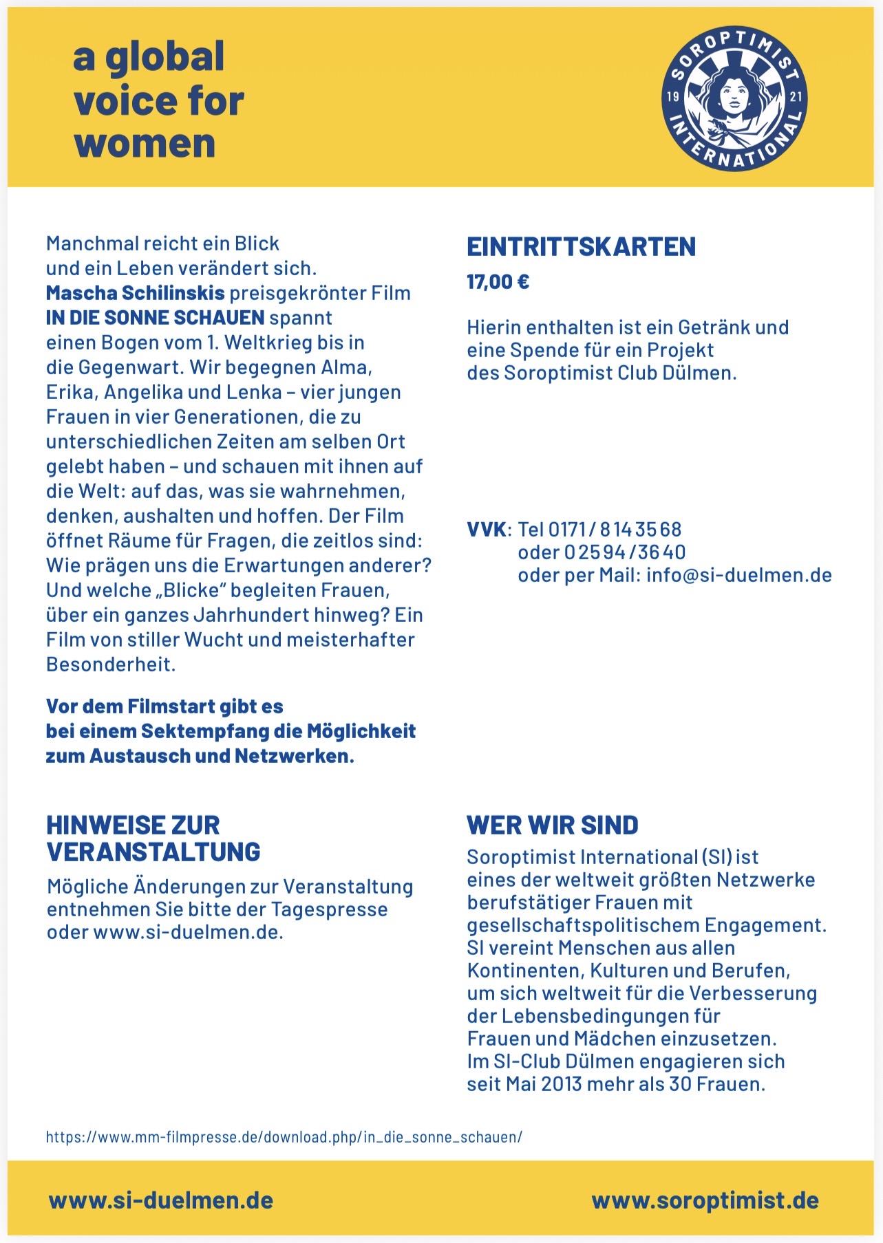 Der Benefiz-Kinoabend beginnt um 19 Uhr mit einem Sektempfang und Zeit für Gespräche und Begegnungen. Um 19.45 Uhr startet die Filmvorführung. Der Eintritt kostet 17 Euro. Darin enthalten ist eine Spende für ein Projekt des SI-Club Dülmen. Soroptimist International ist ein weltweites Netzwerk engagierter Frauen, das sich für bessere Lebensbedingungen von Frauen und Mädchen einsetzt. Auch der Dülmener Club engagiert sich seit 2013 mit regionalen sowie internationalen Projekten. Karten sind im Vorverkauf unter 0171/8143568 oder 02594/3640 sowie per E-Mail an info@si-duelmen.de erhältlich.